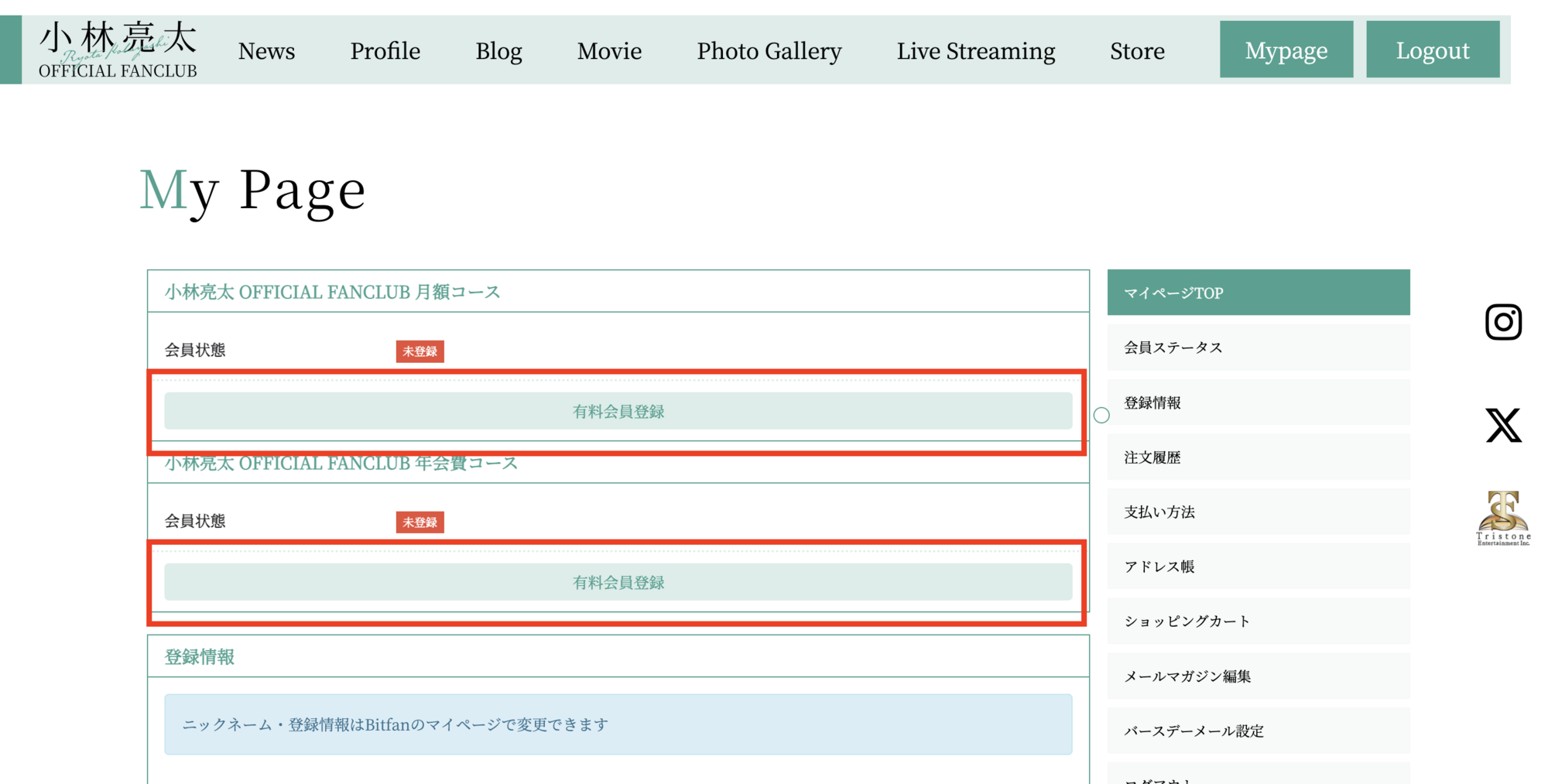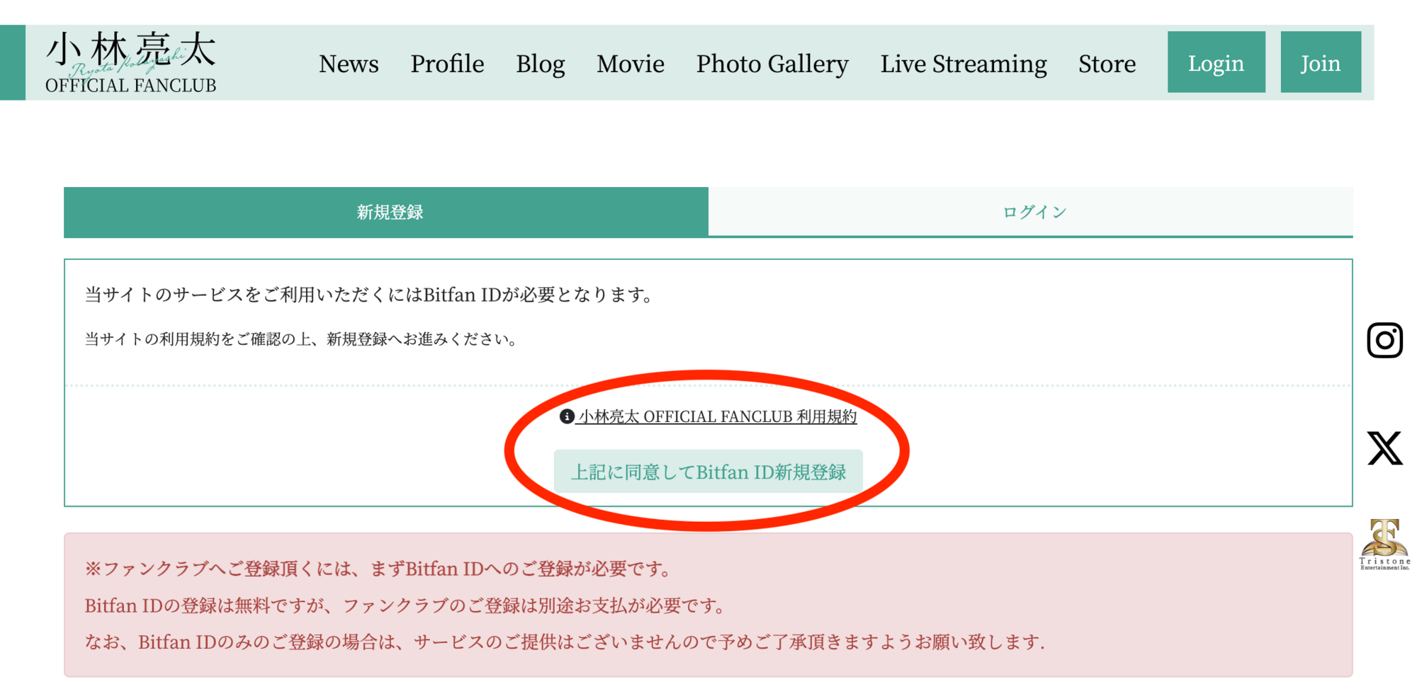 TOPページのファンクラブメニューより「JOIN」をクリックしてください。